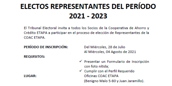 A todos nuestros Socios de la COAC ETAPA, realizamos una cordial invitación a quienes desean formar parte de nuestro Gobierno Cooperativo 2021-2023 puedan realizar las inscripciones para Listas y/o Representantes.