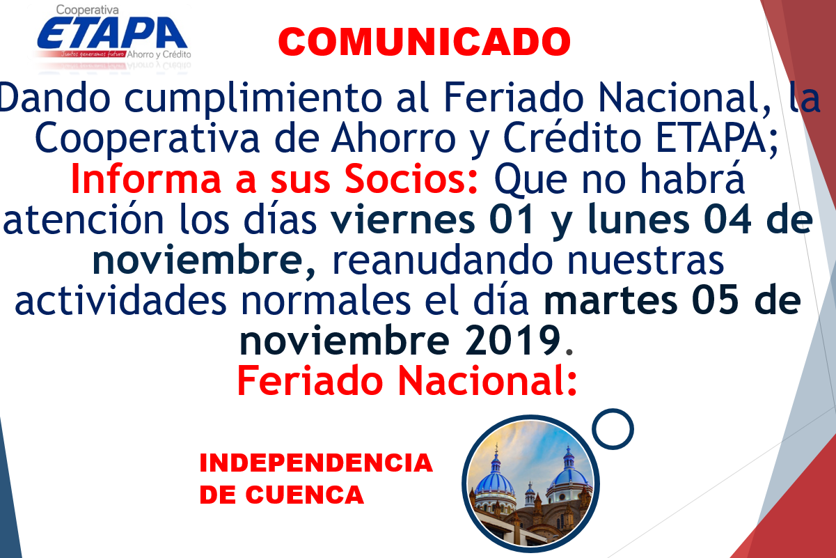 COMUNICADO: 📌👂🔎 Dando cumplimiento al Feriado Nacional, la Cooperativa de Ahorro y Crédito ETAPA; Informa a sus Socios: Que no habrá atención los días viernes 01 y lunes 04 de noviembre, reanudando nuestras actividades normales el día martes 05 de noviembre 2019. Feriado Nacional: INDEPENDENCIA DE CUENCA #CooperativaDeAhorroyCréditoETAPA #JuntosGeneramosFuturo