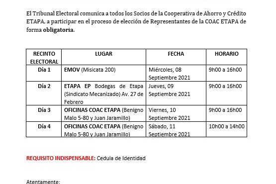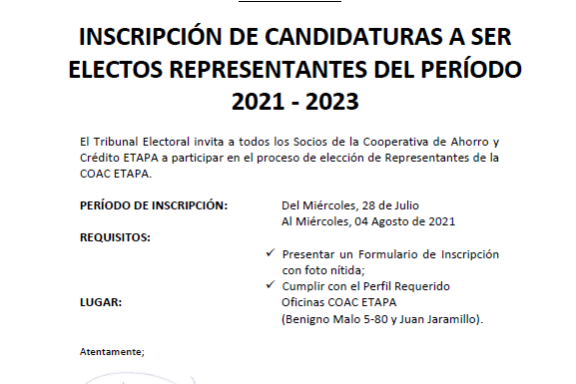 A todos nuestros Socios de la COAC ETAPA, realizamos una cordial invitación a quienes desean formar parte de nuestro Gobierno Cooperativo 2021-2023 puedan realizar las inscripciones para Listas y/o Representantes.